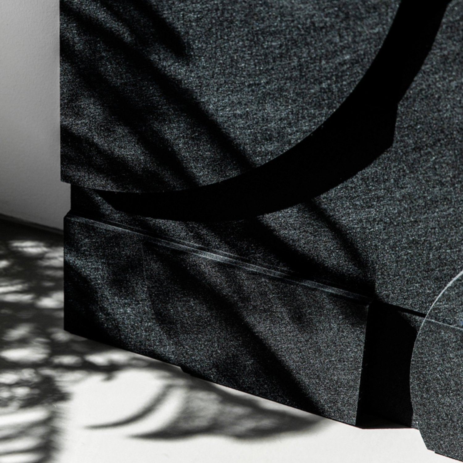 The artworks consists of multiple layers of recycled materials such as PET felt and upcycled materials such as fabric, which creates a tactile and sculptural look.