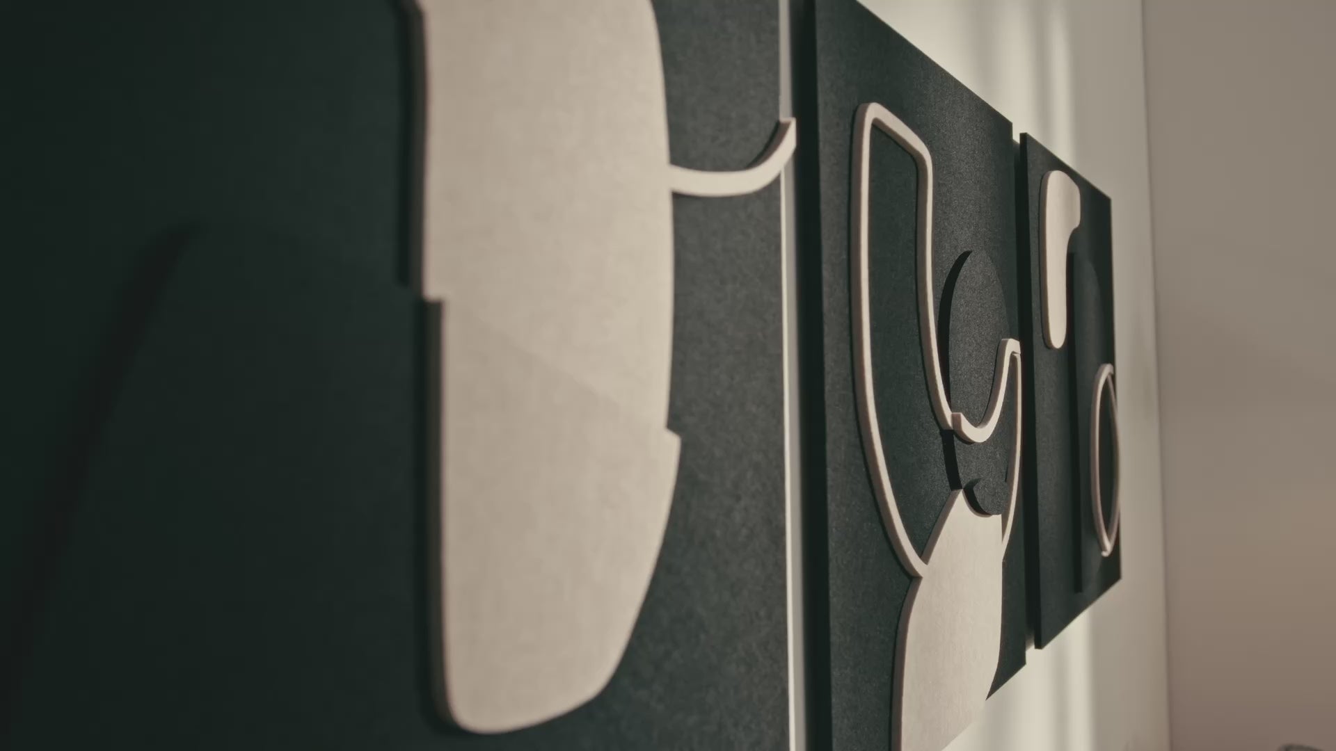 Artistic acoustic panels in minimalist black and beige design above a modern sofa.